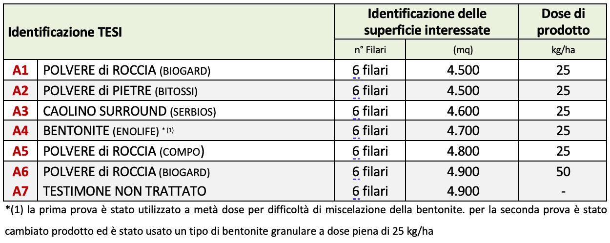 Le prove sono state effettuate nel corso del 2020 su vigneti ubicati in agro di Guagnano. I vigneti su cui sono state effettuare le prove, sono stati impiantati nel 2017, la varietà è Primitivo con sistema di allevamento a spalliera e potatura a Guyot. Per le prove è stato adottato lo schema sperimentale dei “blocchi”. Ogni blocco costituiva una tesi. Nella tabella di seguito riportata vengono indicate le 6 tesi poste a confronto: