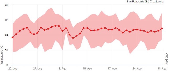 Nelle immagini di seguito riportate vengono riportati i dati meteo registrati nel corso del periodo di svolgimento delle prove 23/07-/30/08:
