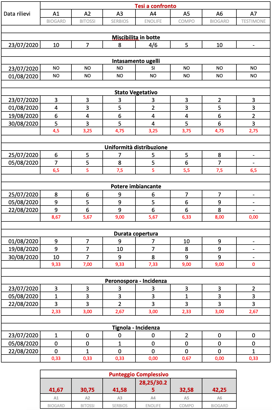 Si segnala che il confronto tra le tesi 1 e 6 che prevedevano un diverso dosaggio per ettaro, non ha evidenziato differenze significative nei risultati rilevati, pertanto sembrerebbe che una maggiore dose non comporti un miglioramento della performance del prodotto testato.